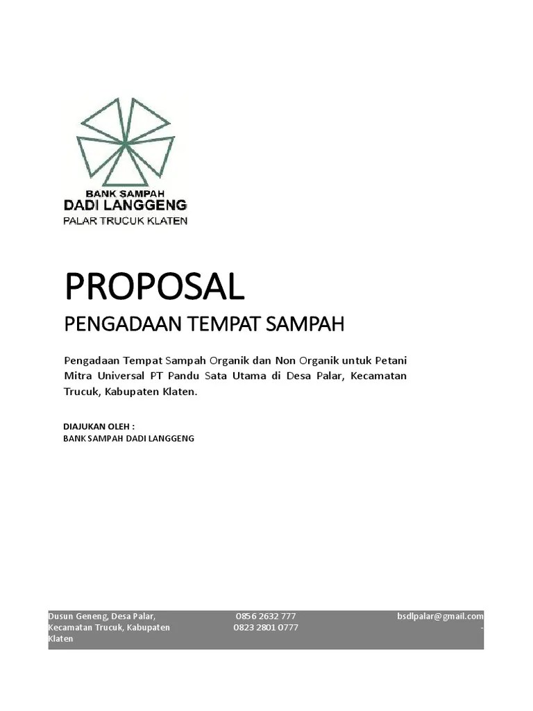 Contoh Proposal Pkm Bank Sampah : Proposal Pengelolaan Sampah Penggambar - Program kemitraan masyarakat (pkm) universitas muhammadiyah yogyakarta (umy).. (bank sampah smp terbuka) sebagai alternatif sahabat lingkungan untuk memperpanjang. Umur bumi di desa cihideung ilir, kabupaten bogor. Diantaranya adalah dengan mengelola sampah organic dan anorganik, untuk . Dan luaran dari kegiatan pkm ini adalah terwujudnya kelompok ibu ibu yang mendirikan bank sampah di beberapa rw yg terdapat di keluharan pejuang. Contoh proposal pkm kt lolos seleksi tahun 2019.